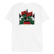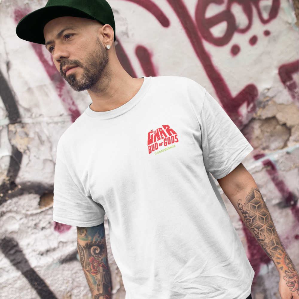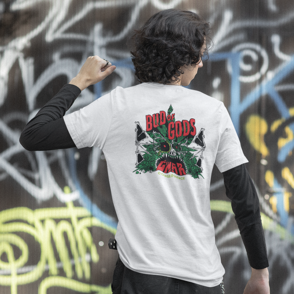 Make your way right to the pit at your next GWAR show with this white "Bud of Gods" shirt that will soon be splattered in blood and various other human innards.