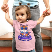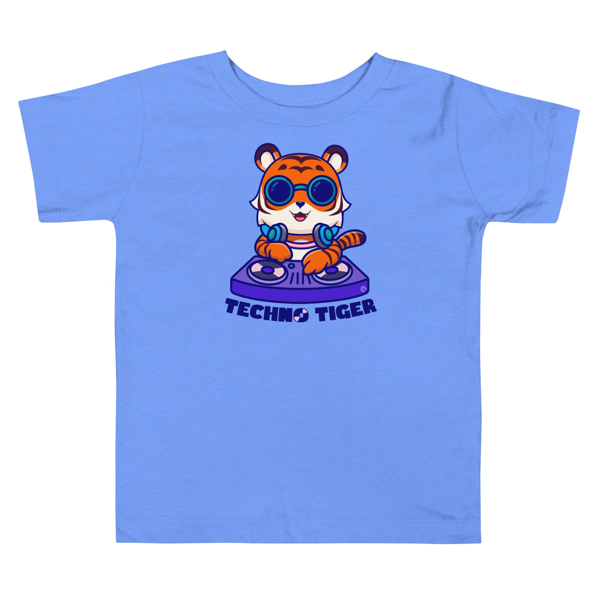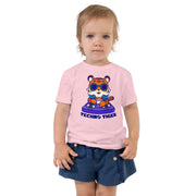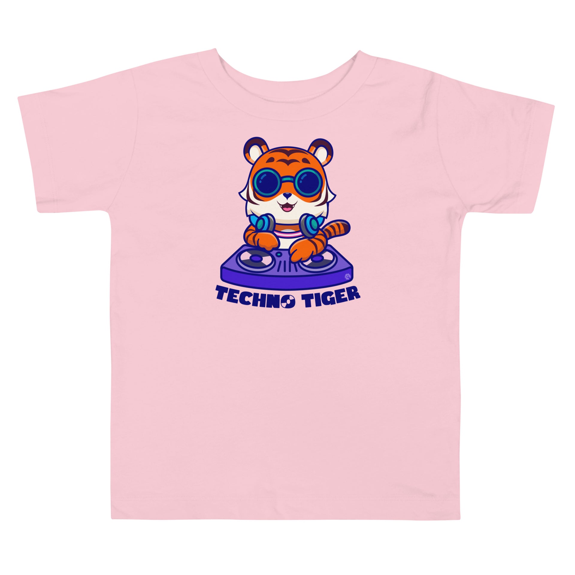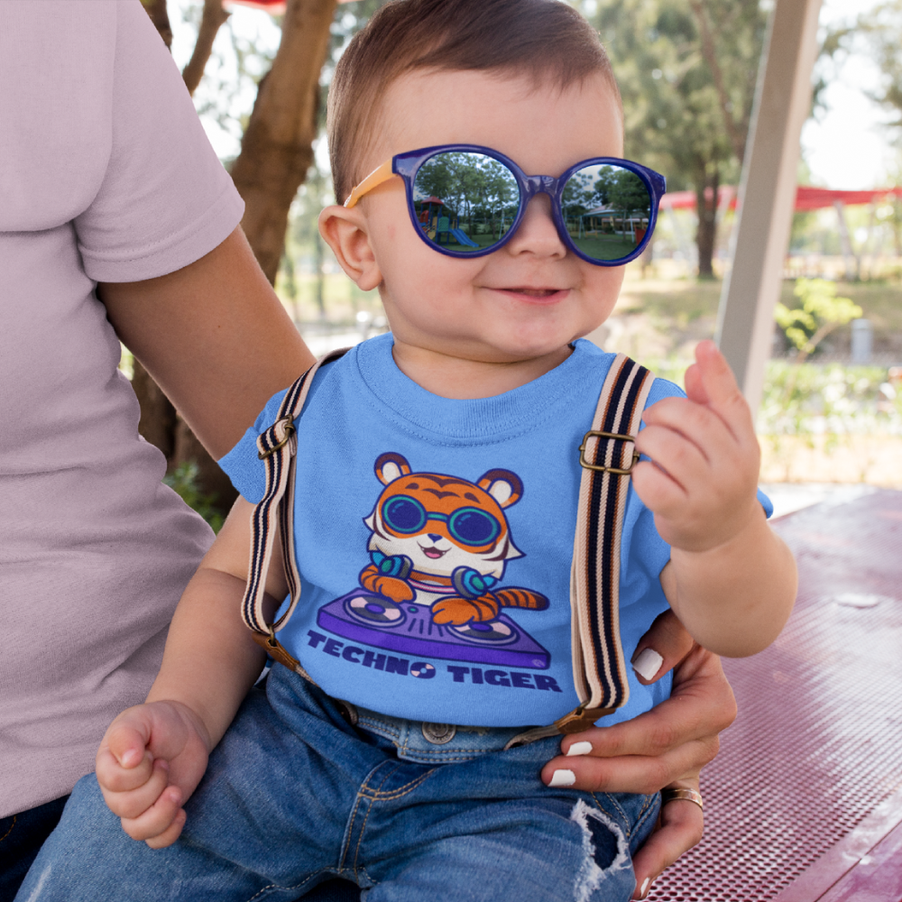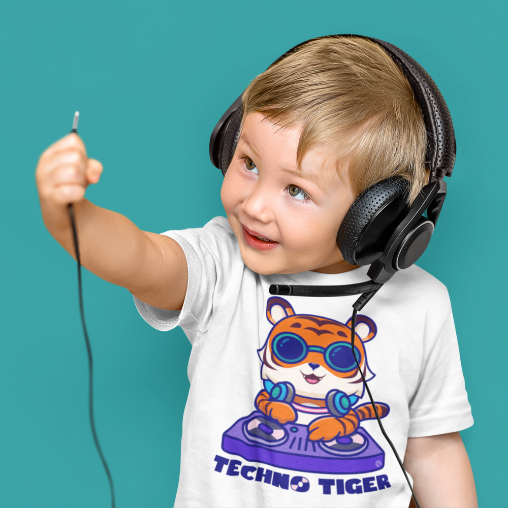 Unleash the beat with the Techno Tiger toddler tee – where wild meets wired, perfect for your little music lover on the move.