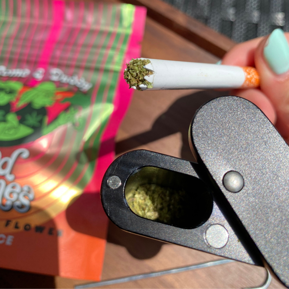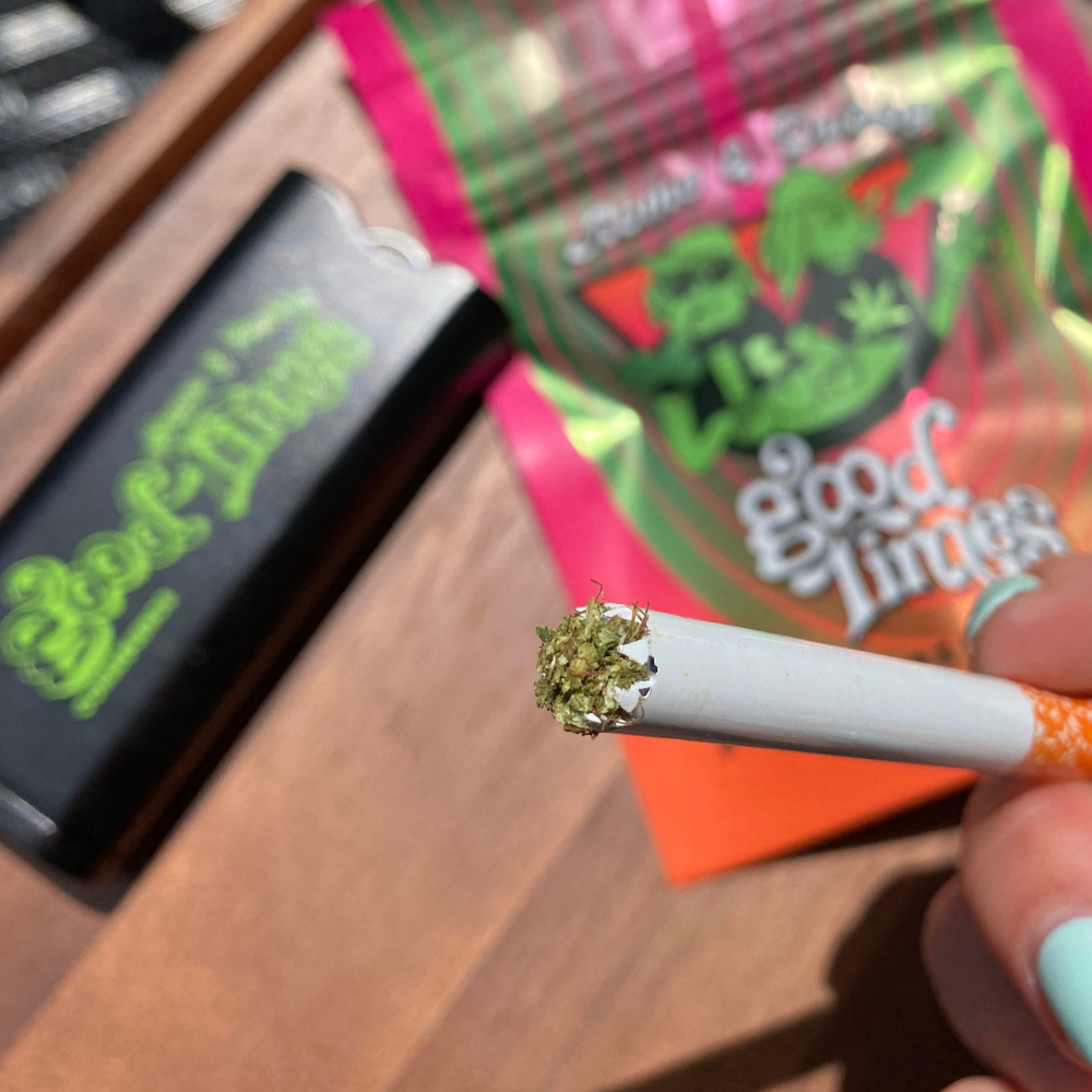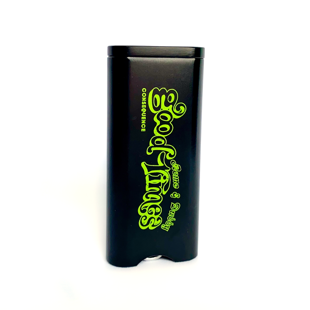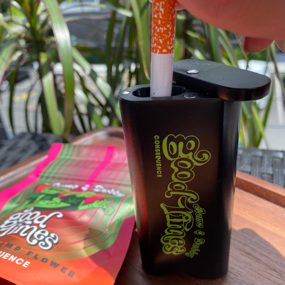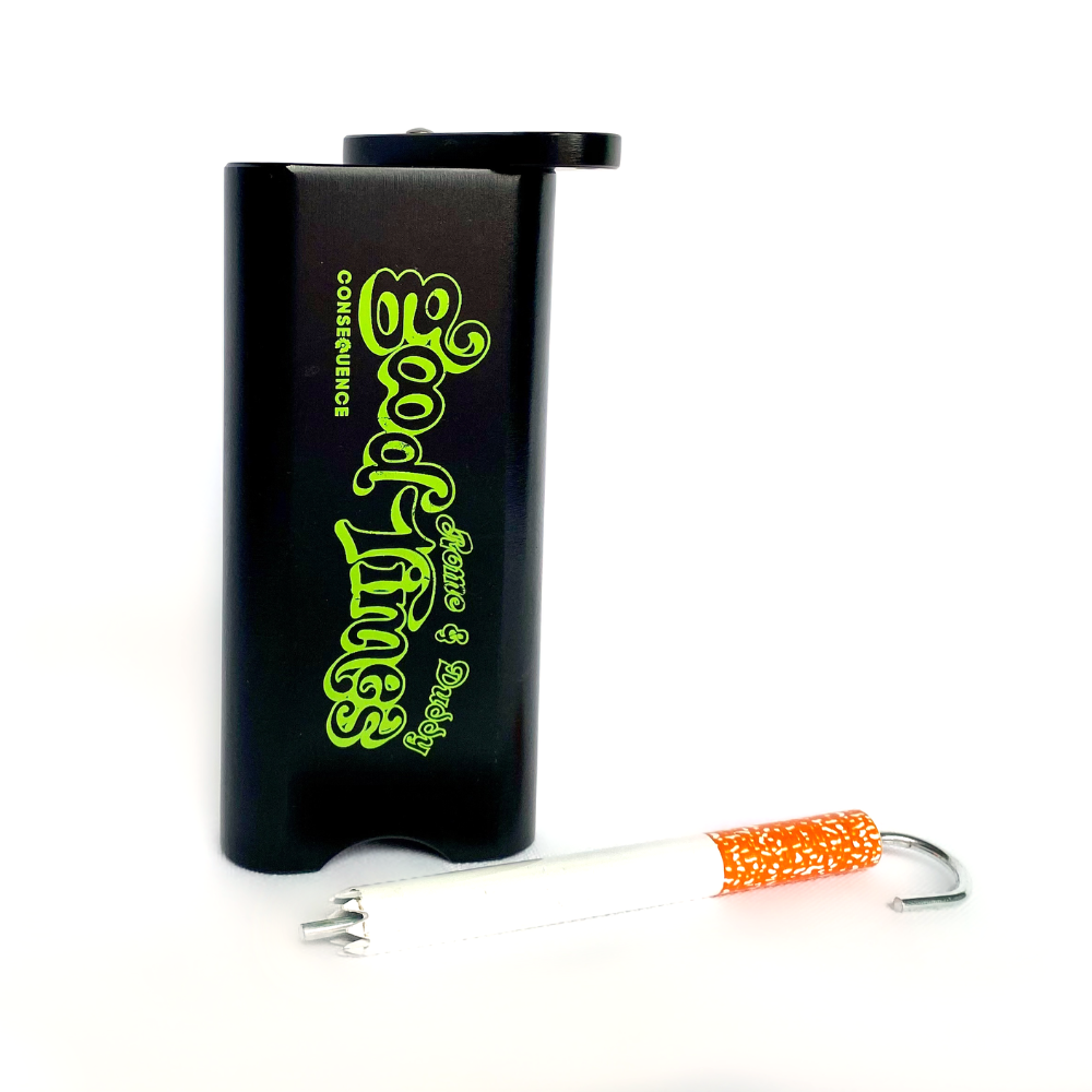 Give the dugout's rotating magnetic lid a twist and out pops a cigarette-shaped pipe, complete with sharp teeth that make for easy packing. And how do you pack it, you ask? Simply dip it into the dugout's pocket, which you've already filled with the sweet, sweet Good Times bud, and you're ready for a hit of happiness.