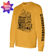 Designed by Steve Fiche, the shirt features an original piece of art celebrating the live concert experience on the front, with a hand-drawn rendition of the Consequence logo down the sleeve. Printed in black on a 100% preshrunk cotton red or gold long sleeve shirt, or on a black shirt with a yellow-grey print.