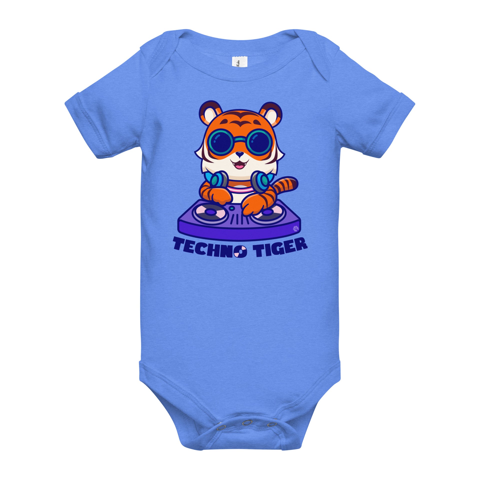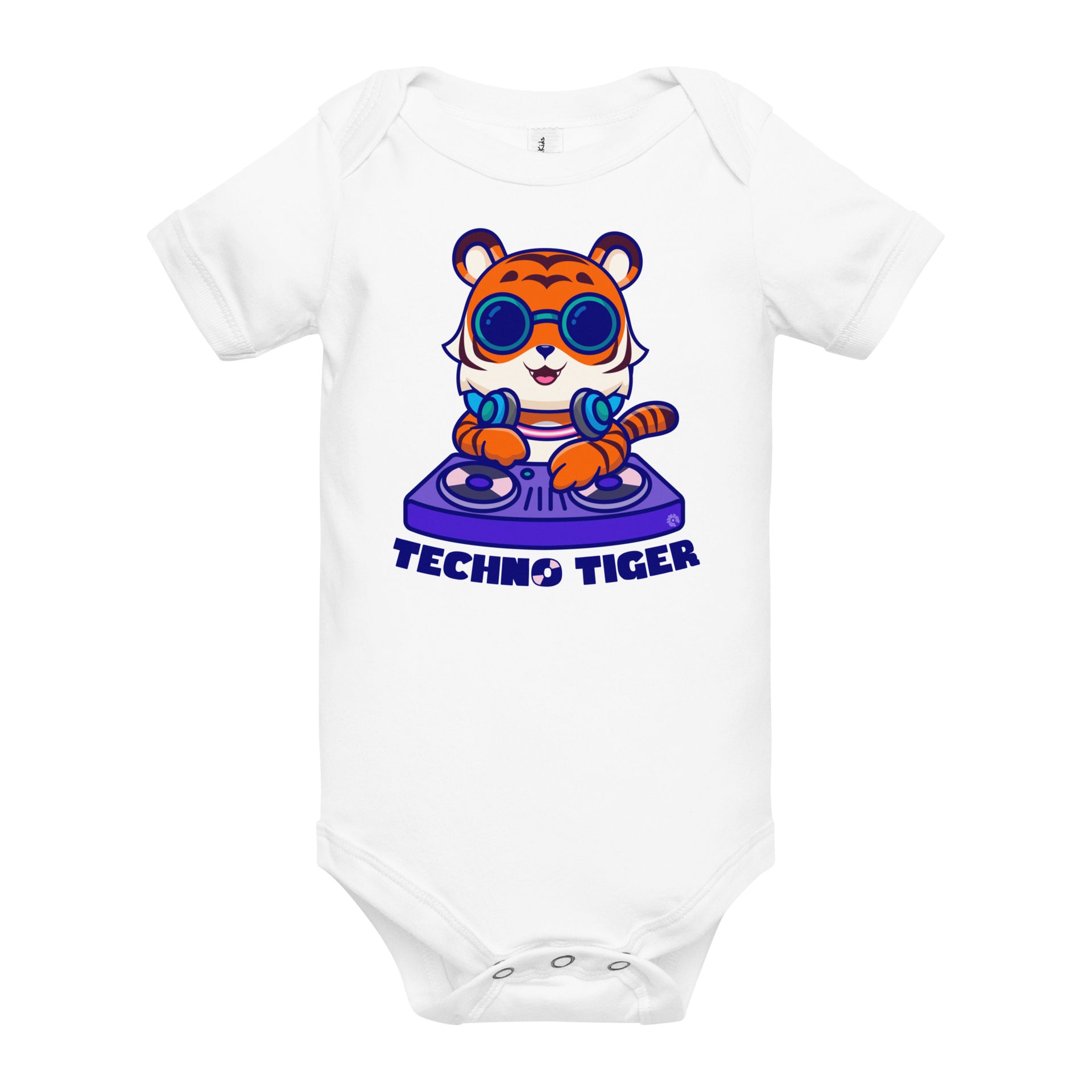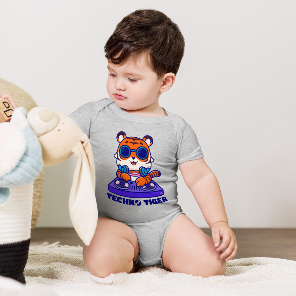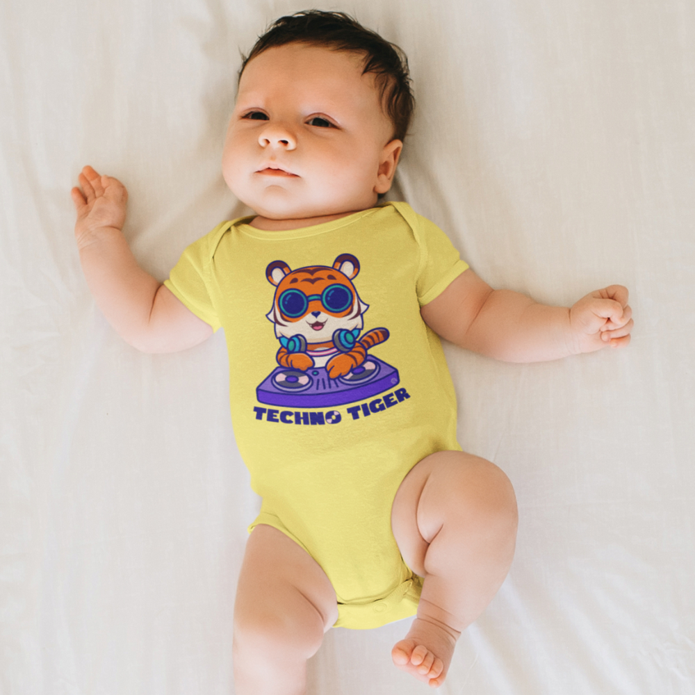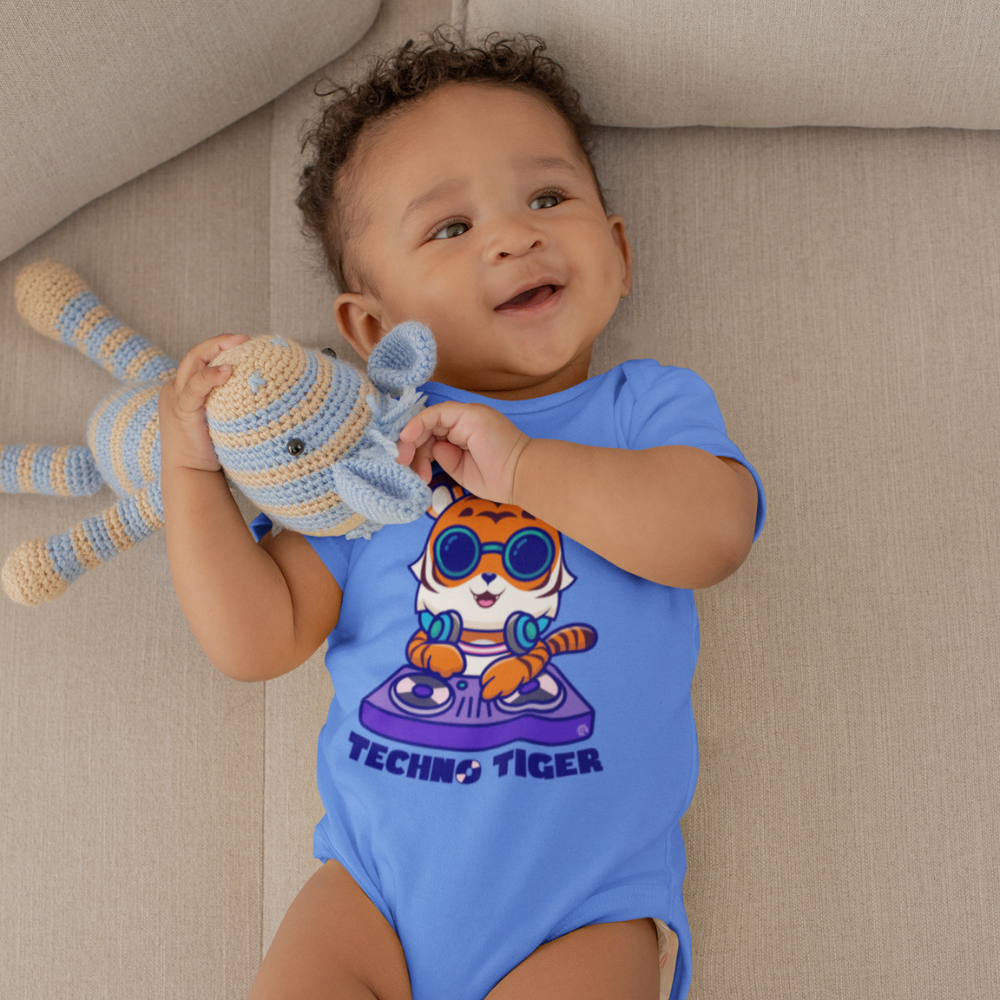 The vibrant Techno Tiger design pulses with a playful, electronic energy, adding a touch of rhythm and fun to every moment. Perfect for future DJs and little groove enthusiasts, this onesie ensures your baby stays stylish and comfy while they rock out in ultimate techno style.