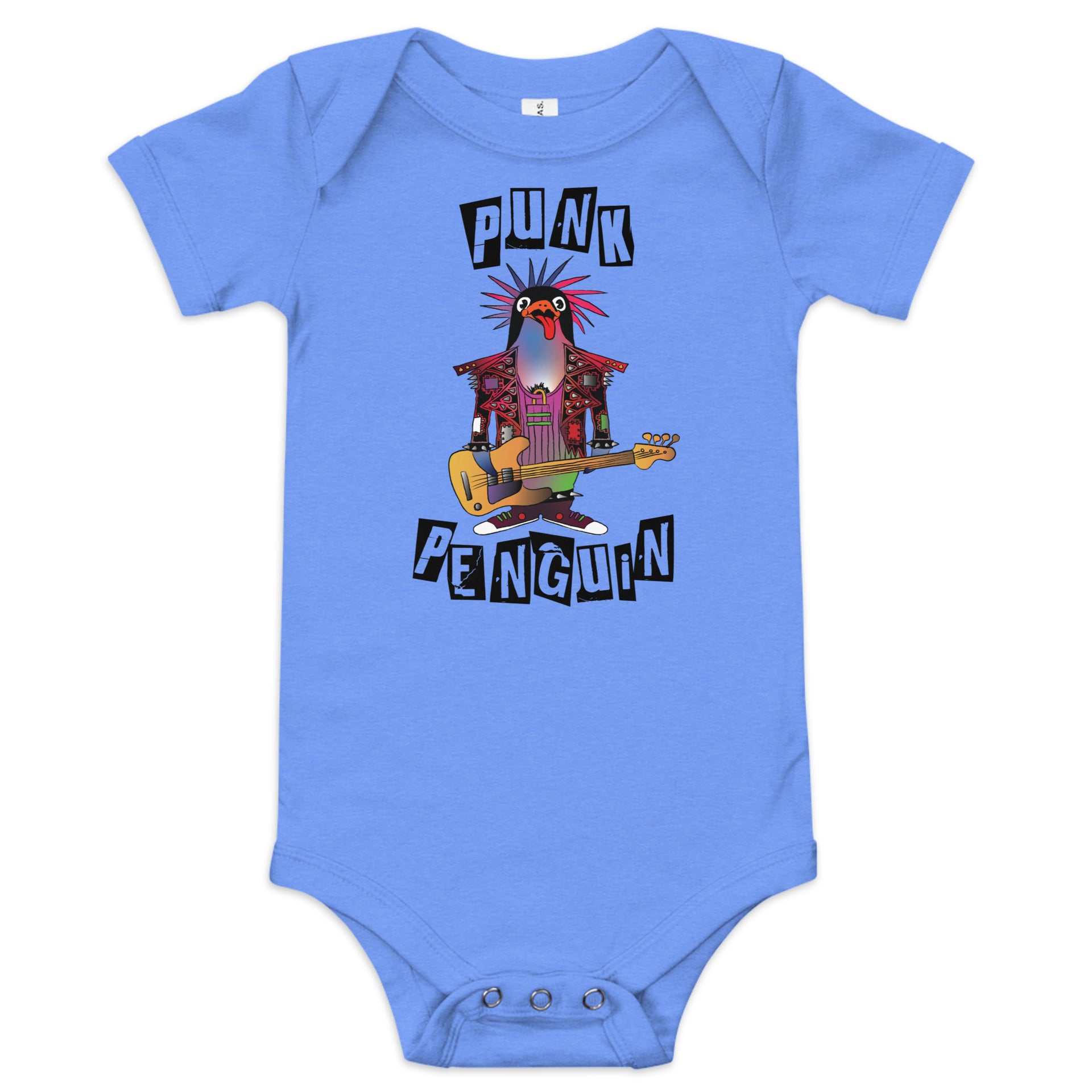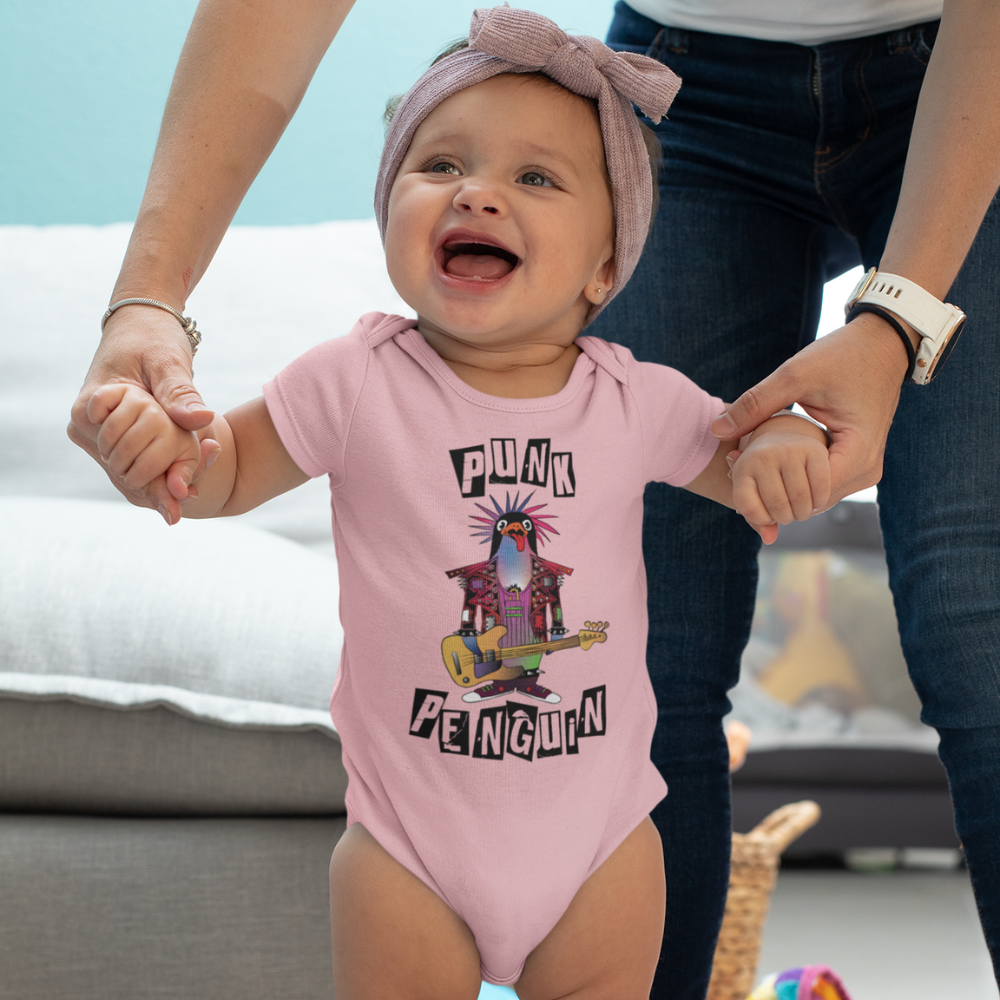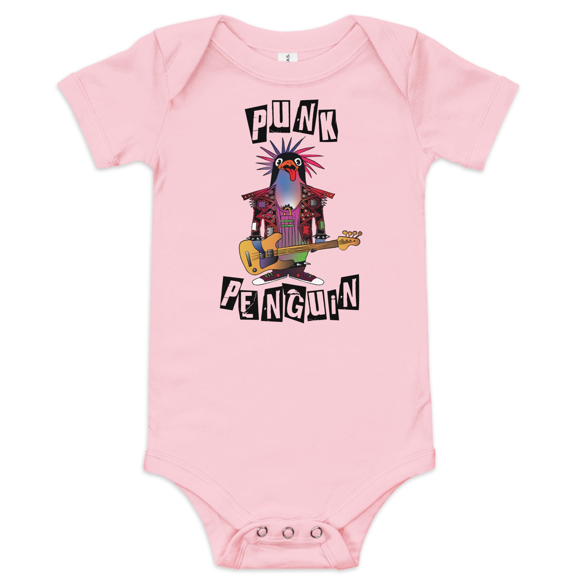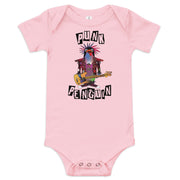 Comfort meets cool with our Punk Penguin Onesie! Crafted with high-quality cotton, your punk rocker in training will stay cozy while rocking a truly original design that signals their incredible taste before they've even taken their first steps. Playtime has never felt more punk, and the pre-shrunk fabric ensures durability wash after wash and jam session after jam session. The easy snap closure promises that this new piece will become a wardrobe staple for your little one. Whether you or your loved ones are punk fans or you just love interesting, fun designs, this is the onesie you didn't know you were missing. Get ready to rock their tiny world!